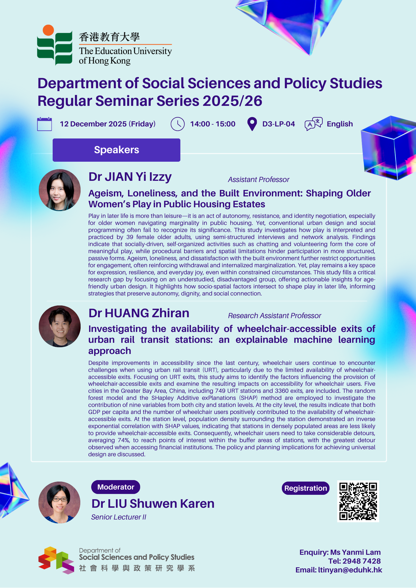 You are cordially invited to attend the Regular Seminar Series 2025/26 organized by the Department of Social Sciences and Policy Studies (SSPS). In these monthly talks, our academic and teaching staff will present their latest research projects or Knowledge Transfer activities. The December 2025 session of the SSPS Seminar will be held on 12 December 2025 (Friday) with details as follows:-
