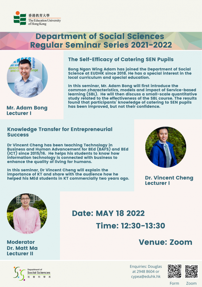 You are cordially invited to attend the Regular Seminar Series 2021-2022 organised by the Department of Social Sciences (SSC). In the monthly talk, our academic and teaching staff will present their latest research projects or Knowledge Transfer activities. The fifth seminar session will be held on 18 May 2022 (Wednesday). Please find the details as follows:
