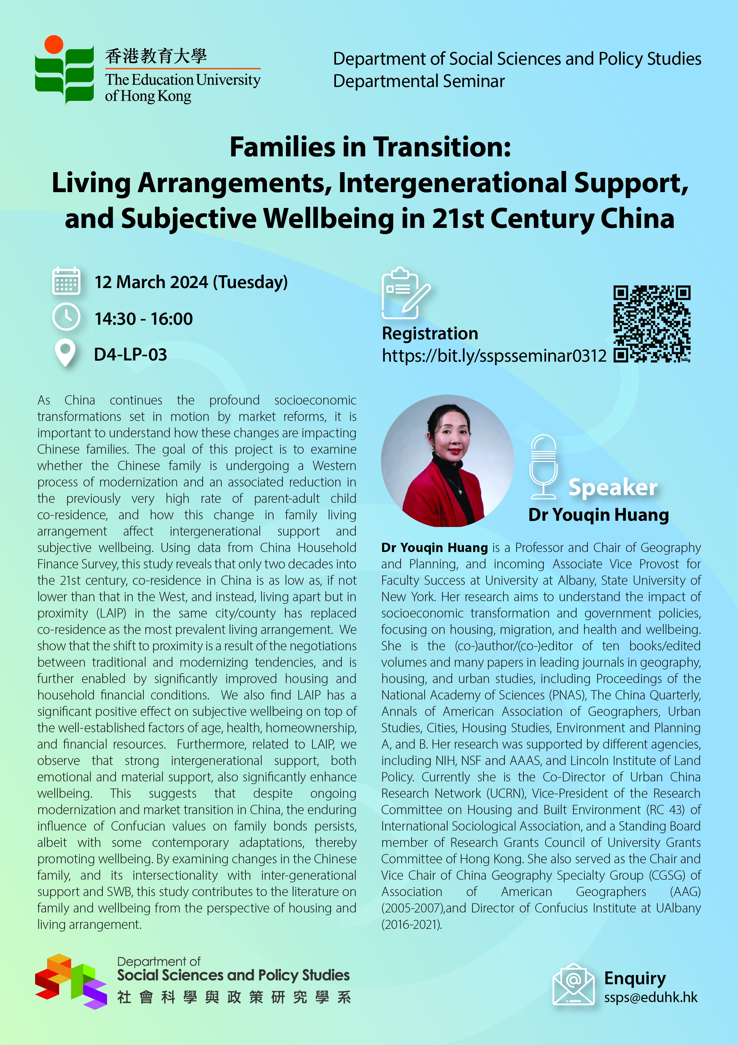 You are cordially invited to join the departmental seminar on “Families in Transition: Living Arrangements, Intergenerational Support, and Subjective Wellbeing in 21st Century China” organised by the Department of Social Sciences and Policy Studies. Details are as follows: