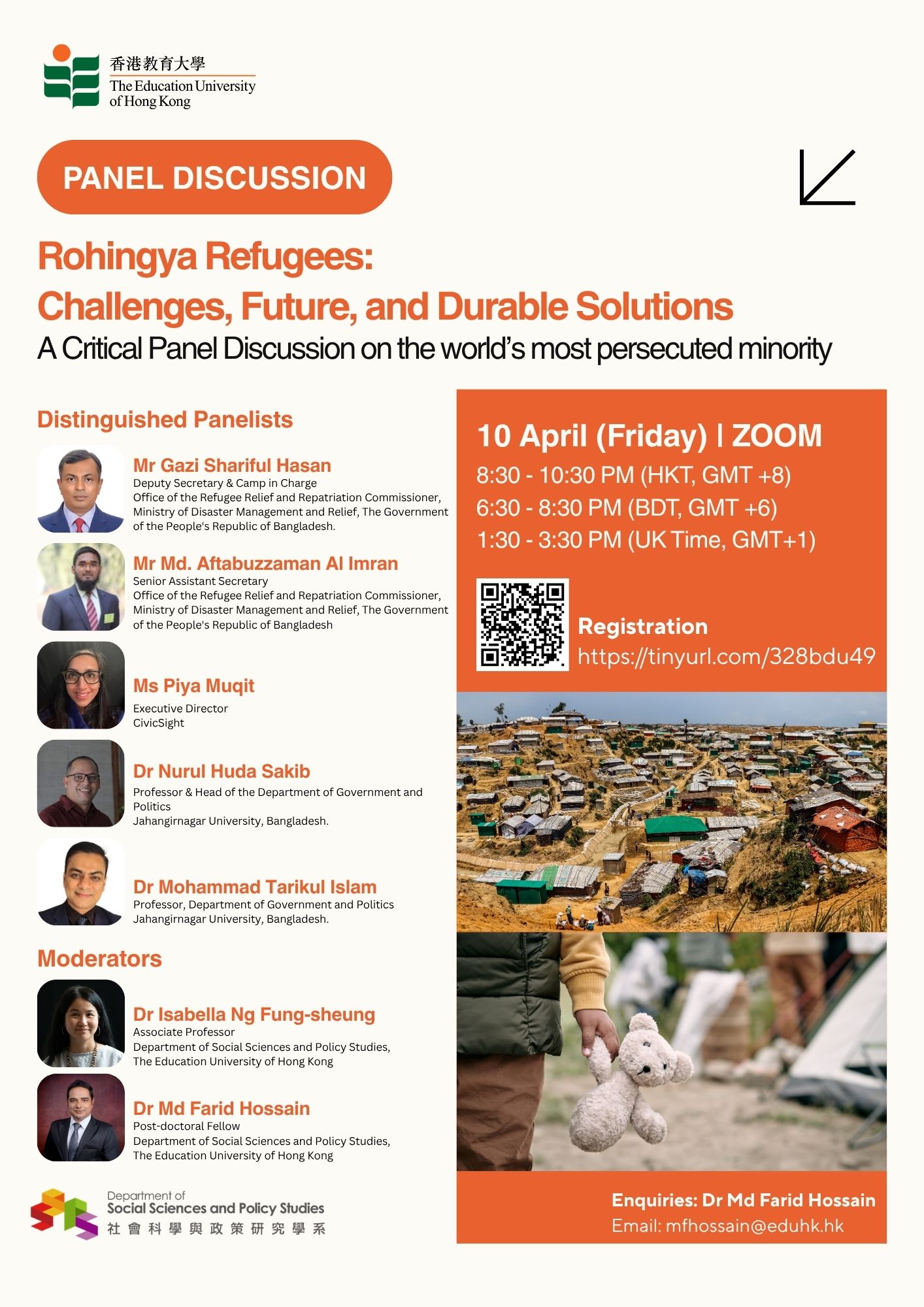 You are cordially invited to attend the panel discussion entitled “Rohingya Refugees: Challenges, Future, and Durable Solutions” organised by the Department of Social Sciences and Policy Studies on 10 April 2026, with the details below: