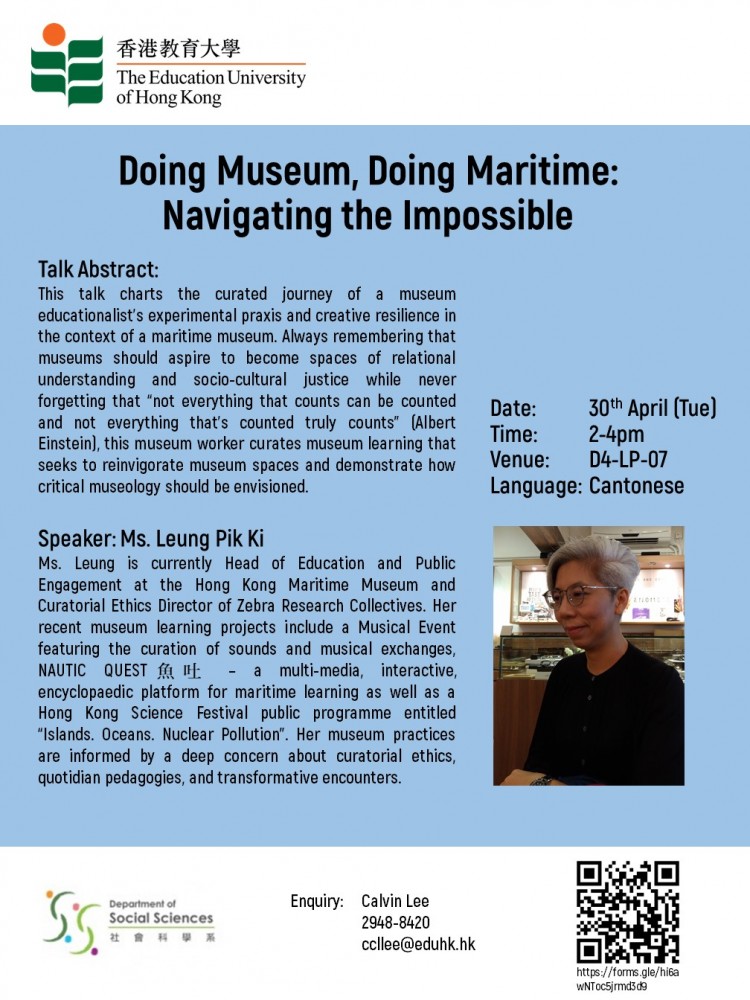 Should you wish to attend, please register at https://forms.gle/hi6awNToc5jrmd3d9. For further enquiries, please contact Mr. Calvin Lee, email: ccllee@eduhk.hk, Tel: 2948 8420.