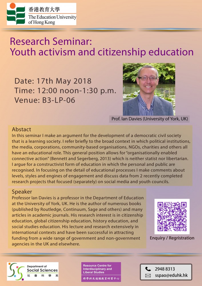 In this seminar I make an argument for the development of a democratic civil society that is a learning society. I refer briefly to the broad context in which political institutions, the media, corporations, community-based organisations, NGOs, charities and others all have an educational role. This general position allows for “organisationally enabled connective action” (Bennett and Segerberg 2013) which is neither statist not libertarian. I argue for a constructivist form of education in which the personal and public are recognised. In focusing on the detail of educational processes I make comments about levels, styles and engines of engagement and discuss data from 2 recently completed research projects that focused (separately) on social media and youth councils.
