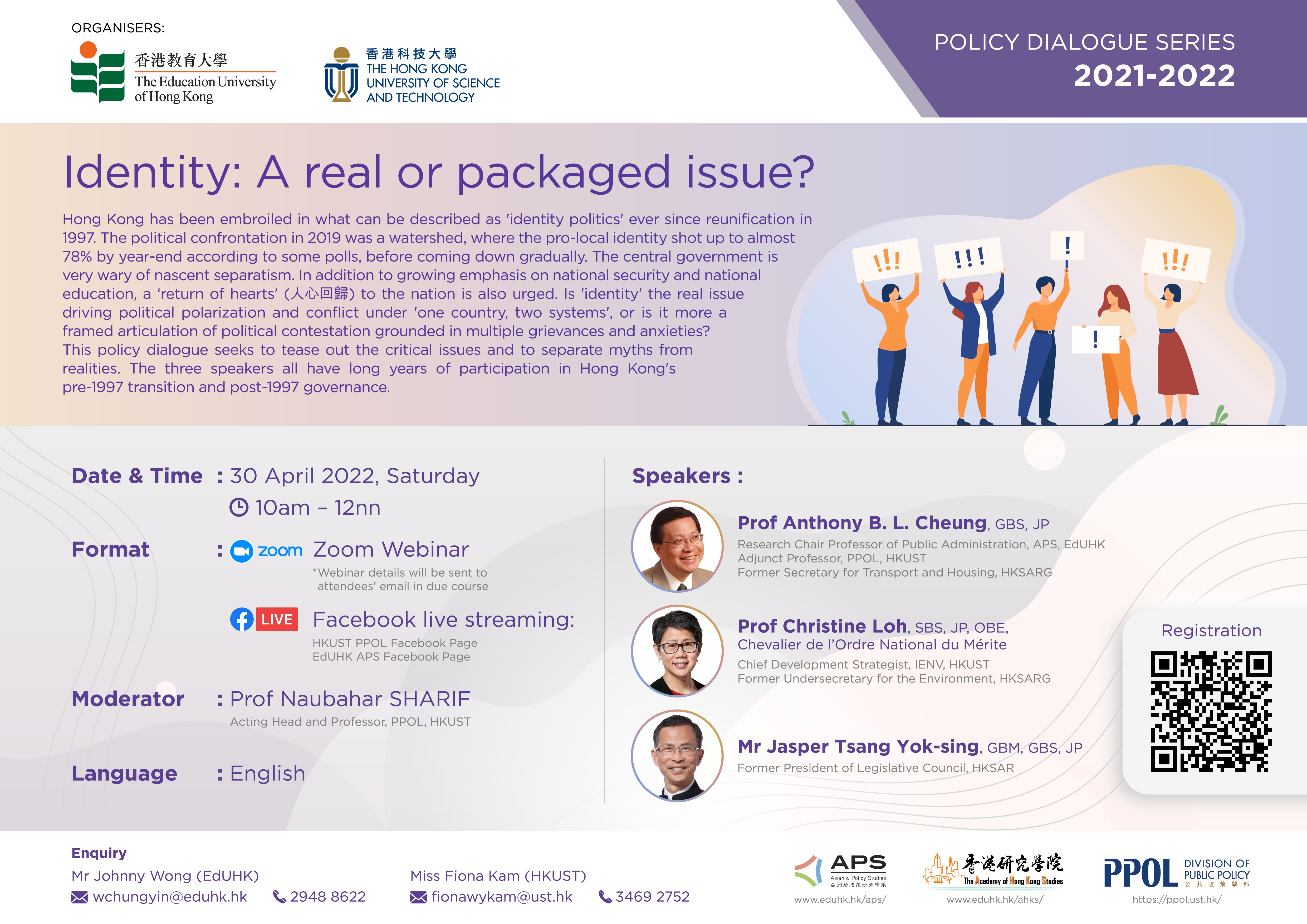 Hong Kong has been embroiled in what can be described as 'identity politics' ever since reunification in 1997. The political confrontation in 2019 was a watershed, where the pro-local identity shot up to almost 78% by year-end according to some polls, before coming down gradually. The central government is very wary of nascent separatism. In addition to growing emphasis on national security and national education, a ‘return of hearts’ (人心回歸) to the nation is also urged. Is 'identity' the real issue driving political polarization and conflict under 'one country, two systems', or is it more a framed articulation of political contestation grounded in multiple grievances and anxieties? This policy dialogue seeks to tease out the critical issues and to separate myths from realities. The three speakers all have long years of participation in Hong Kong's pre-1997 transition and post-1997 governance.