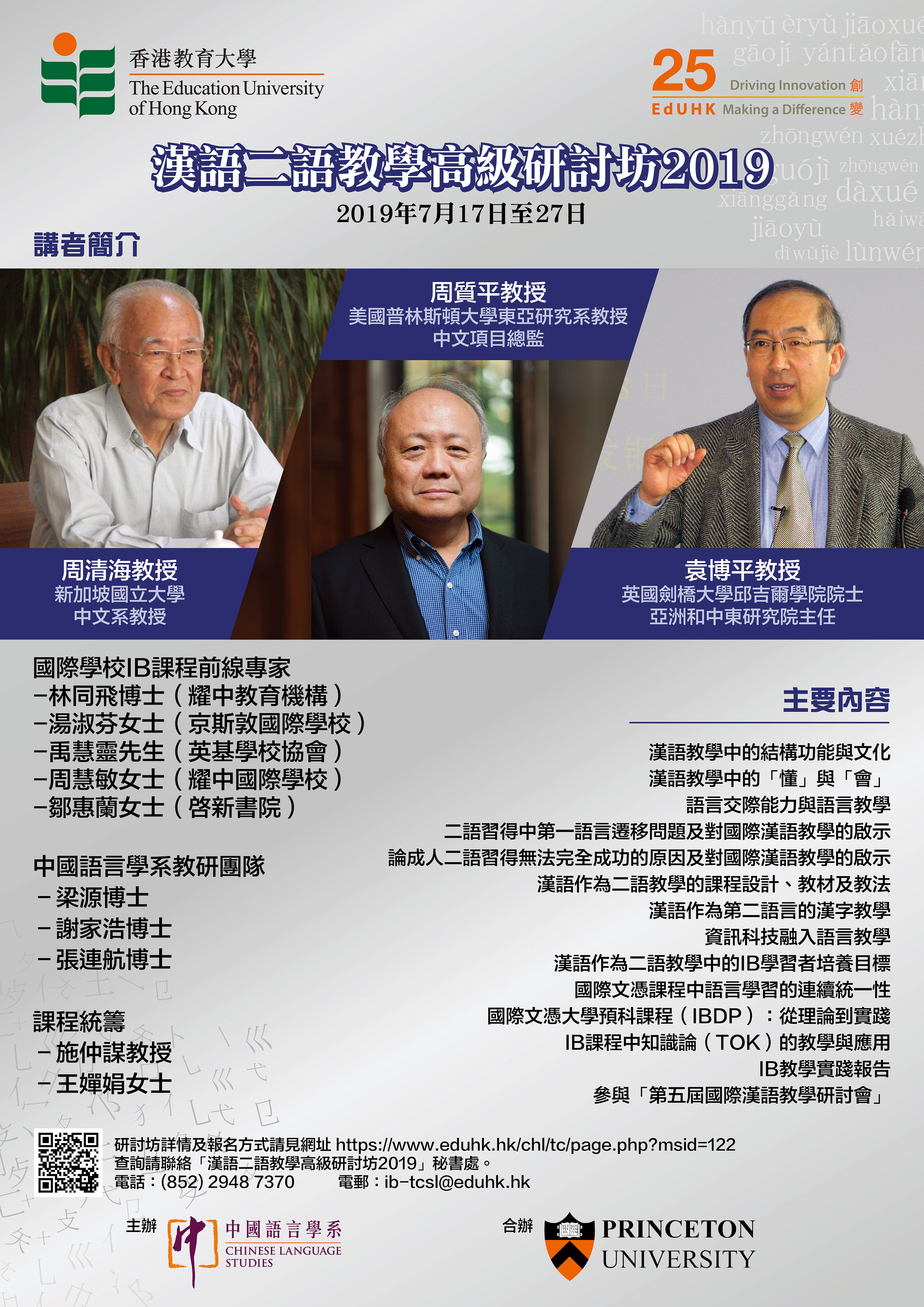 香港教育大学中国语言学系将於2019年暑期与普林斯顿大学中文项目合办「汉语二语教学高级研讨坊」,介绍汉语二语教学及IB汉语教学的相关理论和教法。高级研讨坊将由 周质平教授(普林斯顿大学)、袁博平教授(剑桥大学)、周清海教授(新加坡国立大学)、国际学校IB课程前线专家及中国语言学系教研团队任教。
