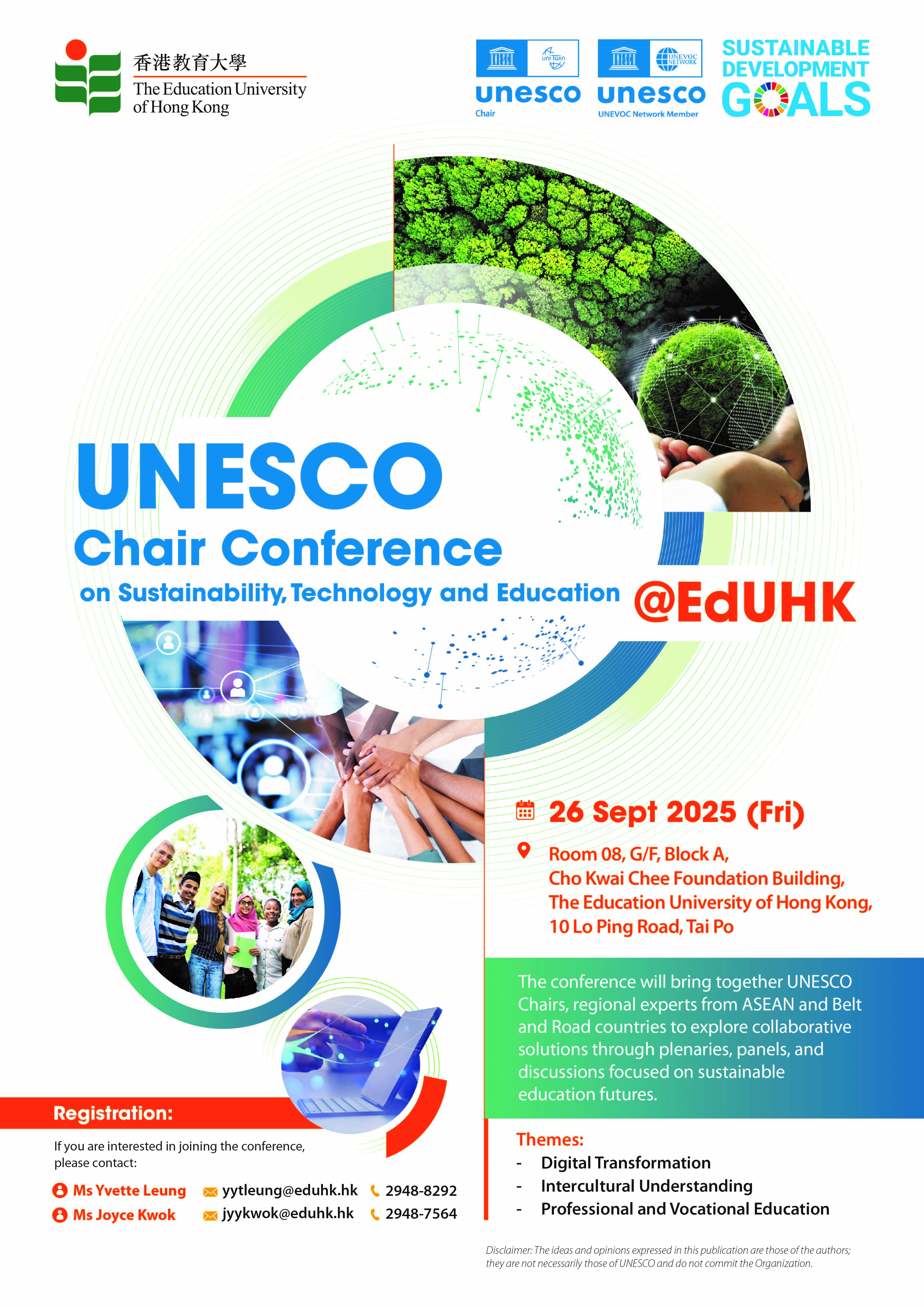 The Education University of Hong Kong is proud to host the UNESCO Chair Conference on Sustainability, Technology and Education on 26-27 September 2025. Convened by Professor John Lee Chi-Kin, UNESCO Chair in Regional Education Development and Lifelong Learning, this international event aims to explore collaborations and partnerships to advance equitable and sustainable education across the region.