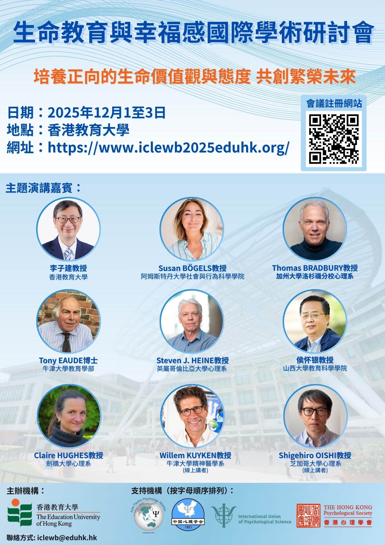香港教育大学(教大)将于二零二五年十二月一至三日于大埔校园举行生命教育与幸福感国际学术研讨会,并于十二月四日举办会后工作坊。
