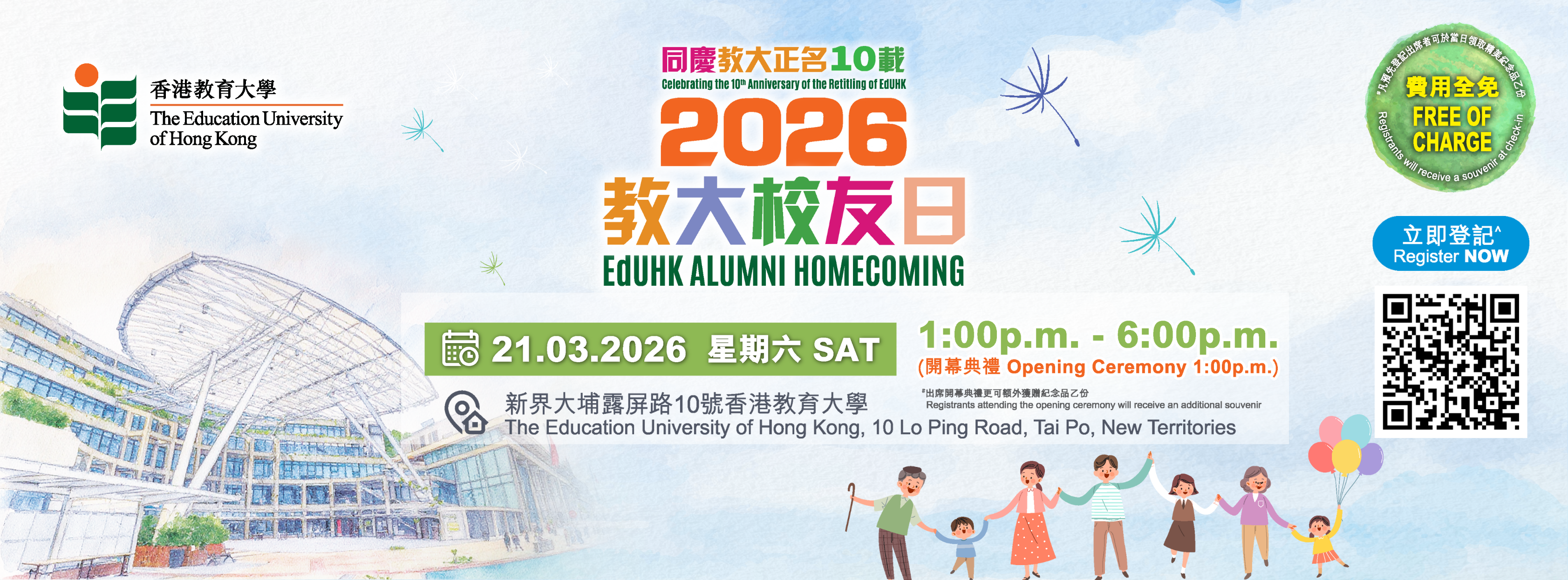 由香港教育大学(教大)校友及拓展事务处举办的「教大校友日2026」将于二零二六年三月二十一日(星期六)在大埔校园举行。当日会有各项精彩活动,包括∶猎蛋嘉年华、杯子蛋糕装饰摊位、导赏团、小食及游戏摊位等,诚邀校友与亲朋好友一同参与!