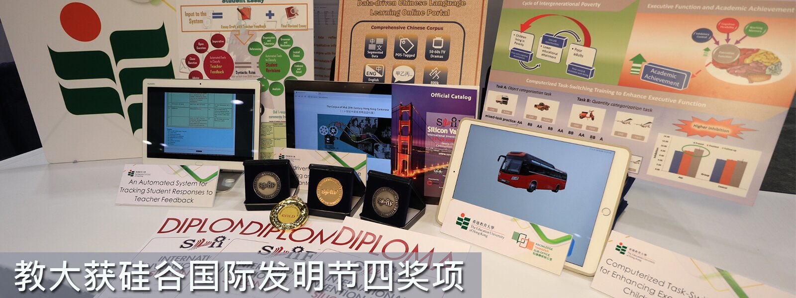 香港教育大学(教大)教育科技发明再次在国际平台上获得肯定。教大团队首度参与美国硅谷国际发明节,三项教育科技项目共获四个奖项,分别是一个金奖,两个银奖及一个特别奖,是首次有本地大学参与该项展览并获得殊荣。