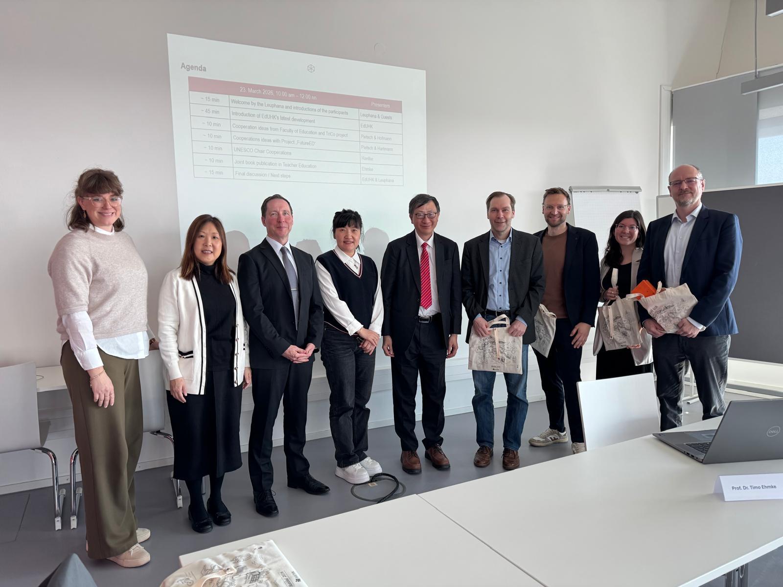 香港教育大學(教大)校長李子建教授率領代表團於 2026 年 3 月 23 日至 27 日期間訪問歐洲,先後到訪四所知名學府,包括德國呂訥堡大學、荷蘭格羅寧根大學,以及匈牙利德布勒森大學及厄特沃什・羅蘭大學。期間,教大分別與格羅寧根大學、德布勒森大學及厄特沃什・羅蘭大學簽署合作備忘錄。