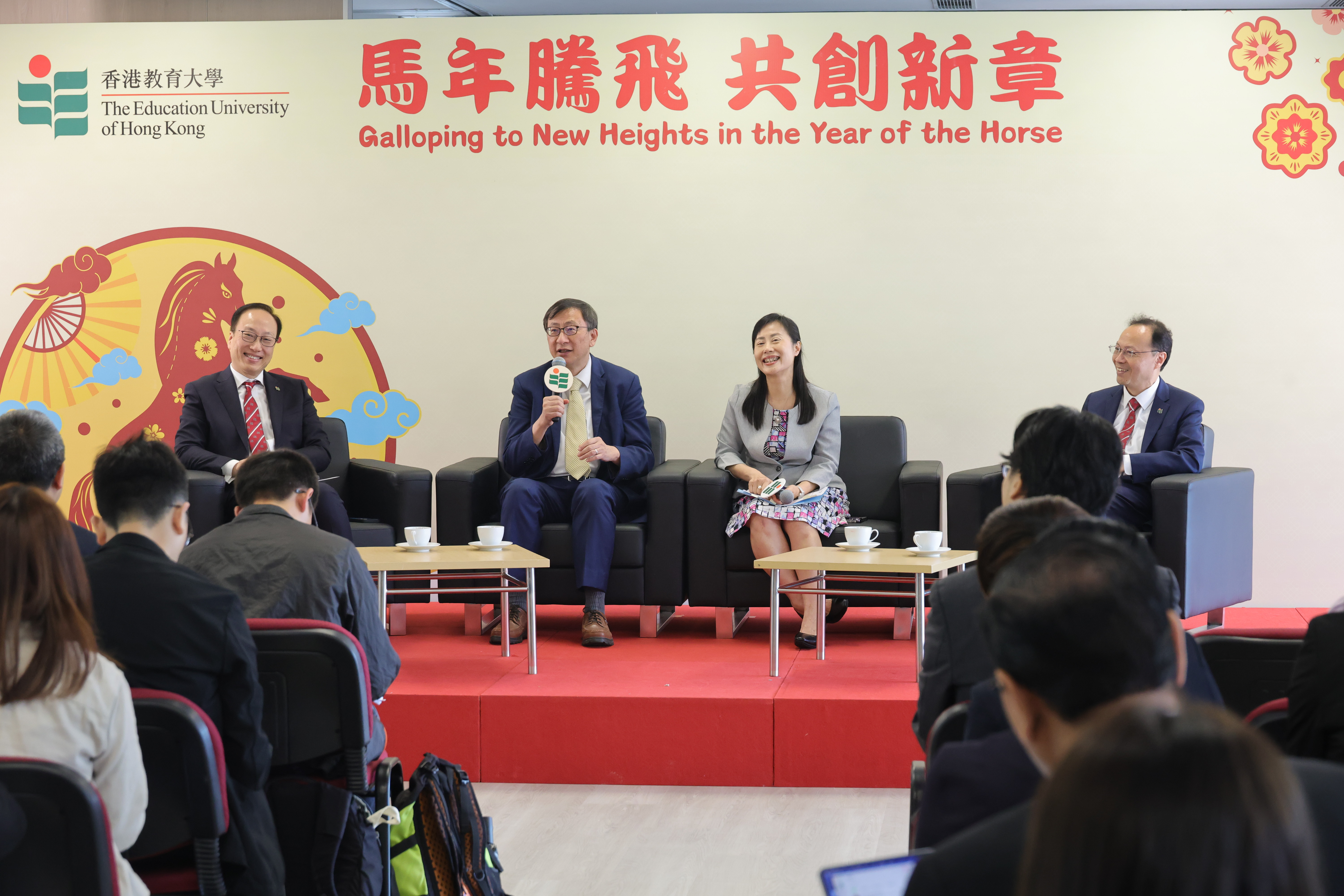 香港教育大學(教大)今日(3月 30 日)舉行傳媒聚會,以「馬年騰飛 共創新章」為題,向傳媒介紹大學未來的多個發展新方向。校長李子建教授、副校長(學術)鄭美紅教授、副校長(研究與發展)陳智軒教授,及副校長(行政)方永豪博士,聯同其他管理層出席聚會並分享大學最新成就及發展規劃。